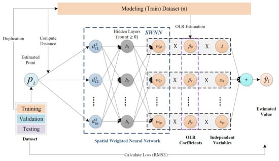 The GNNWR model uses a classic neural network framework, the process flow of which is illustrated in Figure 2. Additionally, 10-fold cross-validation is performed to ensure the robustness and reliability of the algorithm. All layers of the spatially weighted neural network are fully connected, and the dropout technique proposed by Srivastava et al. [] is applied to enhance the generalization ability of the model. Each hidden layer is combined with the batch normalization technique, the parameters are initialized using the method proposed by He et al. [], and the parametric refined linear unit is used as the activation function.