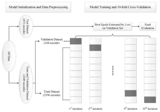 OLS, GWR, and GNNWR are applied to the max–min normalized housing price data, and 10-fold cross-validation is performed to build the models over the training set, as shown in Figure 3. The results for the validation set are used to calculate the root mean square error (RMSE) as the loss function and evaluate the generalization ability. The result with the highest generalization ability is selected for the three methods, and the predictive ability of the model is tested on the test set. From the 2871 records, 431 (approximately 15%) constitute the test set, and the remaining 2440 records are equally divided into 10 groups (each containing 244 records, approximately 8.5%) for the cross-validation process.