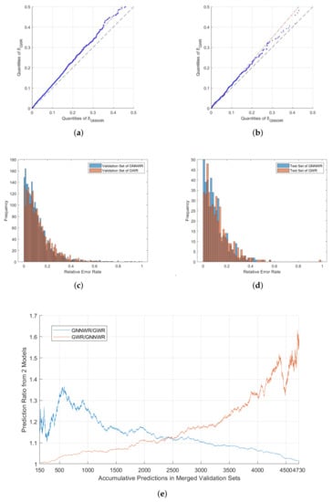 The relative error rate for each prediction over the validation and test sets is calculated. The GWR and GNNWR models are compared using the Q–Q plot as Figure 5a,b, derived using MATLAB. It should to be pointed out that no more than 5% of the points are not shown outside this range.