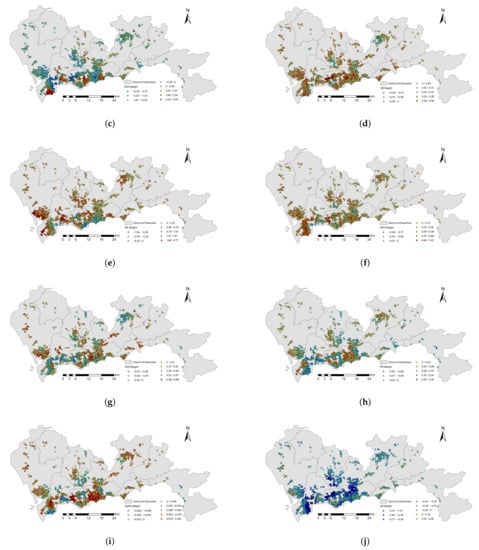 Coefficient Weight Distributions of Variables for GWR model. (a) Intercept; (b) Age of Building (AB); (c) Distance to the Nearest Subway Station (DSS); (d) Green Ratio (GR); (e) Management Fee (MF); (f) Number of Parking Spots (NPS); (g) Number of Subway Stations within 1 km radius (NSS); (h) Plot Ratio (PR); (i) Quality of Available Public Schools (QAPS); (j) Sea Distance (SD).