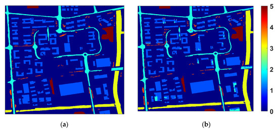 The validation dataset was made up of a pair of multispectral (MS) and panchromatic (PAN) images acquired by the Chinese GaoFen-2 satellite over Shanghai, China, on 2 January 2015 [27]. The spatial resolutions of the MS (with blue, green, red, and near-infrared bands) and PAN images are 4 m and 1 m, respectively. The corresponding image size is 1200 × 1220 pixels. There are five classes in this image scene, i.e., building, roads, water, trees, and grasses, which are denoted as numbers 1–5 in the figure. Figure 1 shows the classification results for the MS and PAN images, and the corresponding ground-truth reference map. This dataset was used to verify the robustness of the optimal allocation of the stratified samples.