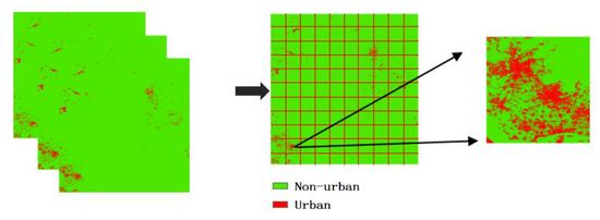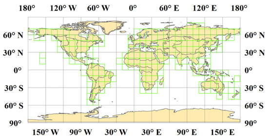 This research study focused on a new multi-temporal global urban land-cover product from 2000 to 2010 with a five-year interval, based on Landsat imagery [28]. The multi-temporal global urban land-cover data range from 80 degrees north to 60 degrees south and were produced by the normalized urban area composite index (NUACI) method proposed by Liu et al. [28], based on the Google Earth Engine platform. The presented mapping results also have two limitations. Firstly, artificial infrastructures such as interstate highways and paved settlements have difficulty in being detected using nighttime light data, which may decrease the accuracy of the urban land cover. Secondly, the binary classification simplifies the mixed pixels problem of Landsat images and, thus, has a poor accuracy in tropical areas and arid areas. The global urban land-cover dataset for each period contains 224 map sheets. These 224 map sheets have a 30 m spatial resolution and cover a 10° × 10° area (Figure 2). The two classification categories in this dataset, i.e., urban and non-urban in Table 1. The accurate interpretation of urban land-cover data can help us understand the transformation of nature by humans and provides data support for ecological environmental change monitoring. This dataset was used to verify the applicability of spatio-temporal stratified sampling. The objective of this research study was to assess the accuracy of the global urban land-cover product and its corresponding uncertainty at a 95% confidence interval, based on a stratified sampling design [7].