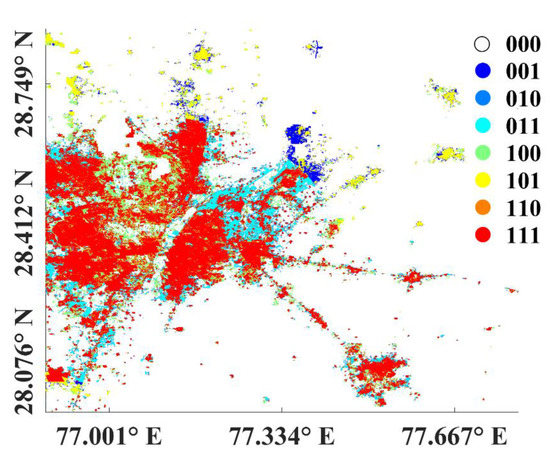 Differing from the previous study using stratified random sampling with classification labels as the strata [30], the temporal stratification conducted in this study was based on the combination of the land-cover types in three different dates. Considering the changes and unchanged in the three periods, there are 8 types of temporal changes. An example of the temporal post-classification is shown in Figure 3. Here, we denote urban as ‘1’ and non-urban as ‘0’.