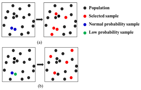 Urban land-cover data possess clustering characteristics, and neighboring pixels can be selected together with a high probability of being in the same class. Due to the high correlation between adjacent pixels in the spatial domain, selecting one pixel can provide enough information for accuracy assessment, and including its surroundings is a waste of time. Therefore, we eliminate the spatial correlation between sample units by using a spatial sampling design in order to obtain more representative samples. After determining the sample size corresponding to each stratum of the ecological region, LPM is used to select the sample pixels. Grafström et al. [38,39] proposed LPM for spatially balanced sampling. During the experimental operation, the spatial position of the pixel is used as auxiliary information to achieve spatially balanced sampling. Figure 4 shows a comparison between simple random sampling (SRS) and LPM. In Figure 4a, the nearby pixels have the same probability of being selected, leading to a poor distribution of samples, as shown in the right. In contrast, LPM assumes that the probability of two nearby pixels being selected as samples at the same time is very low. For example, once we select a pixel as a sample, the sampling probability of its neighboring pixels is updated using the update criterion. As shown in Figure 1b, the two pixels demonstrated a high degree of negative correlation with the inclusion probability. If there are two or more units with the same close distance, the sample will be randomly selected from these closest units with equal probability. This yields an improved distribution for the selected samples, as shown in Figure 4b. According to the update criterion, the sample is updated with the inclusion probability until all units in the target area are traversed once. LPM is used to update the inclusion probability, and Equation (4) or (5) are used as the update criterion until all units are traversed once [40].
