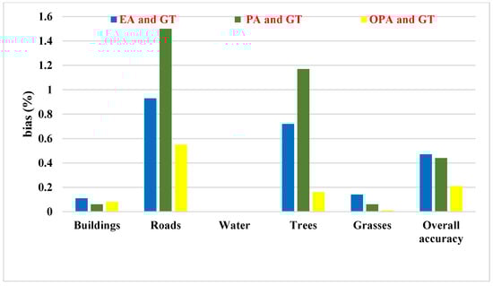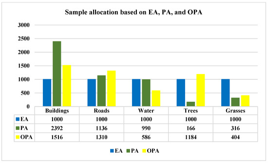 In total, 100 samples were randomly selected from each category for interpretation and judgment, and an initial prejudgment error matrix was generated, as shown in Table 3. The samples allocated to each type of land cover based on EA, PA, and OPA are shown in Figure 5, where EA divides the samples equally among each type. The method of OPA allocates the sample sizes for buildings, roads, water, trees, and grass as being 1516, 1310, 586, 1184, and 404, respectively. PA allocation results in land-cover types with large area proportions possessing more assigned samples.