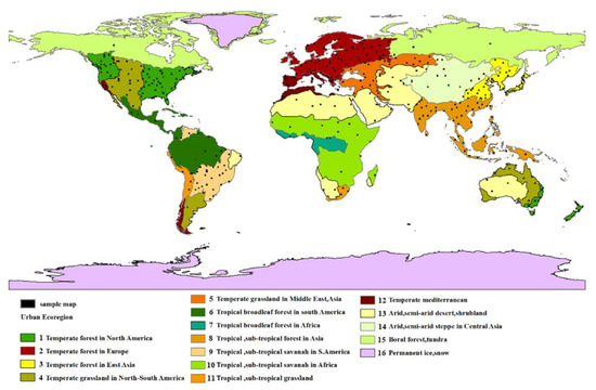The sample’s map sheets were allocated according to the proportion of urban area in each ecological region. The number of sample map sheets in each ecological region is listed in Table 4. Ecological region number 16 covered by perennial ice and snow was not considered in this study as there is no urban area. Because the tropical broadleaf forest in Africa, the boreal forest, and tundra regions cover a small land area, the number of sample map sheets allocated to them is small. The land area of the temperate forest in North America and the temperate forest in Europe accounts for 19% and 15.4% of the total land area of the world. Under the principle of allocation according to the proportion of urban area, the corresponding sample size for these map sheets is 72 and 58, respectively.