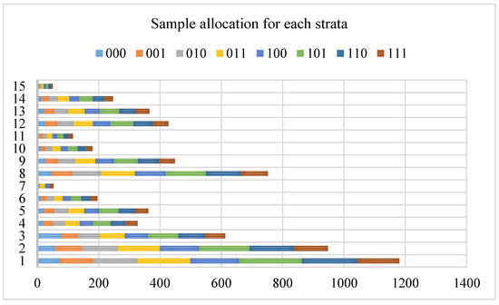 The bias calculated between the true values and the three different allocation methods is shown in Figure 6. The bias obtained with the optimal allocation (yellow bars) is always smaller than the others, indicating that the samples selected from the optimal allocation are closer to the true values. The experimental results showed that the allocation of sample size by the proposed method results in the smallest bias, compared with the equal allocation and proportional allocation. The comparison provides quantitative information on how to reasonably allocate samples to these strata [31].