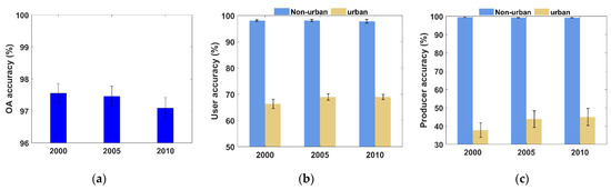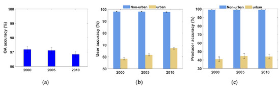 Previous research regarding the accuracy assessment in urban area only considers the stable urban, stable non-urban, and urban gain, i.e., (000, 001, 011, and 111). If we only consider the accuracy calculation of samples from these four layers, samples from other layers will not be included in the calculation. The overall accuracy for the three phases for urban expansion and no change is 96.9 ± 0.3% (Figure 13). From Figure 14a, the overall accuracy for urban land in the three phases significantly improved, compared to the eight-layer change type. The user’s accuracy and producer’s accuracy have the same trend (Figure 14b,c). The OA estimated for the year 2000 is the highest, and it is slightly lower for 2005 and 2010, which is similar to the previous eight-layer evaluation results. The different sampling designs have a direct impact on the accuracy evaluation results for the product. Compared Figure 13 and Figure 14, the user’s accuracies and producer’s accuracies for the four types of strata are improved, compared to those for the eight types (000, 010, 001, 001, 110, 100, 101, and 111). The least accurate stratum is 011.
