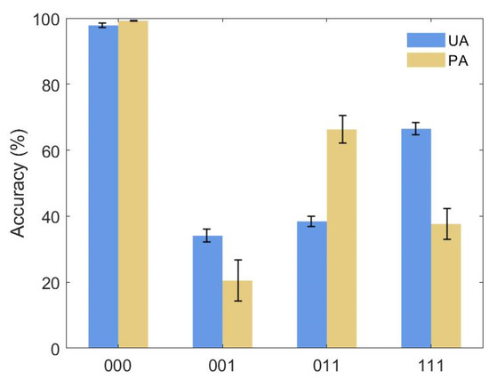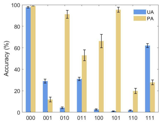 Accuracy estimation of the three phases of urban land for the change and no-change types (000–111 denote the urban land change and no-change types corresponding to Table 5). OA = 96.1 ± 0.25%.