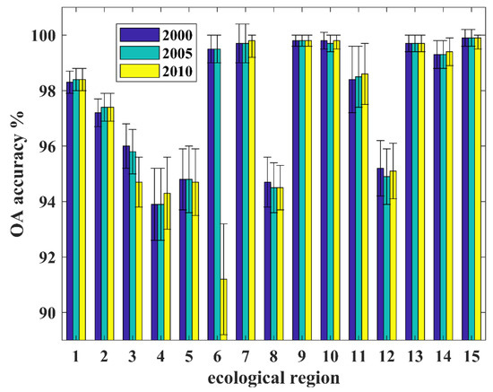 At the ecological region scale, the sample size allocated to each region is determined according to the proportion of the urban area’s extent. Therefore, regions 7 and 9 are allocated a small number of samples. The overall accuracies for the different ecological regions are different, and they are all above 90%, with a standard deviation of less than 1%. The highest accuracies are observed in region 15 for the three periods, and the lowest accuracies are found in region 4 (Figure 12). These results demonstrate that the accuracies are different in both the different years and different ecological regions. Therefore, the ecological regions can be considered as heterogeneous entities, and the regional stratified sampling provides a better understanding of the global urban land-cover product [30].