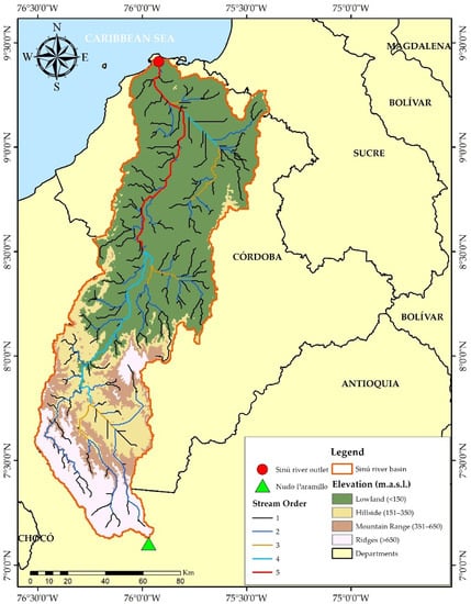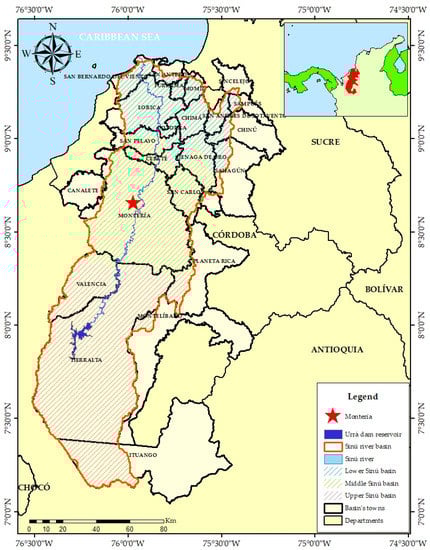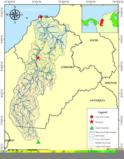 The Sinú river basin is located in the northwestern part of Colombia, between 9°30′ N to 7°05′ N and 76°35′ W to 75°15′ W. It has an area of 13,972 km2, in the jurisdiction of the departments of Córdoba, Sucre, and Antioquia, and according to the provisions of the Regional Autonomous Corporation of the Sinú and San Jorge Valleys, CVS (for its acronym in Spanish), it is divided in accordance with its geographical and biotic characteristics in three zones: the upper, middle and lower Sinú zones or regions, CVS [30].