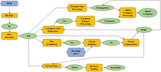 The methodology used to obtain the drainage network of the Sinú river basin is shown in Figure 3, where the input parameters are shown in blue, the procedures carried out on the information in yellow, and the files names generated at each step in green. Thus, through GIS, a filling of the sinks was carried out to correct errors that could occur due to the data resolution or the rounding of elevations to the nearest integer value, and, once a DEM without sinks was obtained, the flow direction from the differences in elevation and slope was determined [41]. Later, to outline the water courses that drain the Sinú river basin, flow accumulation was estimated, which is just the number of cells on the slope that flow towards each cell, and thus the streams were defined.