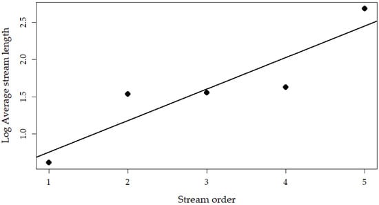 The values of the total and average length of the channels for each order can be seen in Table 2, where it is evident that 54.4% (1245.5 km) of the streams in the basin are of orders 1 and 2. These results corroborate the law of Horton stream lengths [4], which states that: “the average stream lengths of each order in a drainage basin tend to approximate a direct geometric series in which the first term is the average length of streams of order 1”. This is because, when making the graph of the logarithm of the length means against the stream order (Figure 6), it is evident that the points tend to a straight line. In this manner, it can be stated that the drainage network of the Sinú river complies with what was established by Horton [4] in terms of the behavior of the quantity and average length of the streams of a certain order. This implies that in the study area, the streams of order 1, having a lower mean length than the others, prevail in the areas where the steepest slopes are found.