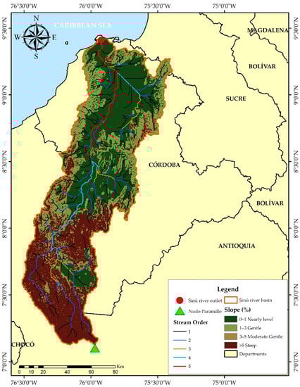 The results shown in the slope maps allows us to infer that the areas where the slope is low is where the mirrors or surface water bodies of the basin are located (lower and middle Sinú), while the highest percentage of the flow of the main currents comes from the southern area where the elevations and slopes are higher, favoring high drainage density and channel frequency [65,68].