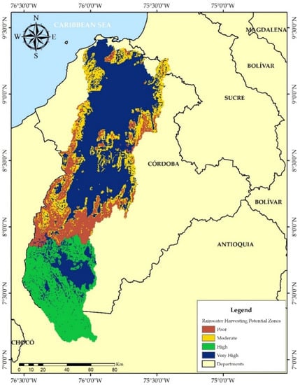 According to the analysis conducted, more than 70% of the basin area has characteristics suitable for rainwater harvesting. Particularly, it was identified that the areas with a ‘very high’ RWHPI correspond mainly to the middle and lower Sinú regions. Most of the upper Sinú is characterized by a ‘High’ RWHPI; however, it is also evident that most of the zones with ‘Poor’ RWHPI are concentrated in the upper Sinú, specifically in the region close to the middle Sinú. On the other hand, the zones with ‘moderate’ RWHPI are scattered in small patches throughout the middle and lower Sinú. Finally, it is important to note that the areas with a ‘very high’ RWHPI coincide with the presence of water bodies such as reservoirs and swamps.
