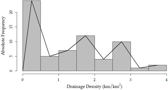 Drainage density corresponds to the total length of streams per unit area and makes quantitative determination of whether a basin is well or poorly drained possible [4]. This parameter is related (together with the number of channels of order u) to aspects such as soil erosion and runoff, since the flow is directly proportional to the drainage density, which translates into rapid runoff that implies an increase in the peak flow of the hydrograph. Additionally, drainage density has an inverse relationship with infiltration, since high infiltration tends to inhibit the development of longer drainages, i.e., the lowest drainage densities correspond to regions with permeable soil types, dense vegetation, and low relief, while the high drainage density prevails in regions with impermeable soils, sparse vegetation, and high relief [10,21,47].