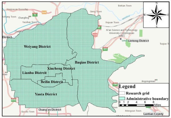 Xi’an is an important central city in western China. Many studies have focused on the development of the taxi industry in Xi’an [58,59]. In addition, Xi’an has a long history of urban construction, and its road network has typical characteristics of ancient Chinese cities. Thus, Xi’an is a valuable experimental sample to analyze the relationship between taxi driver income and road network topology. At present, Xi’an has 11 municipal districts and 2 counties. Taxi pick-up and drop-off points are mainly located in the main urban area of Xi’an, and passengers generally do not take taxis when traveling to outer suburbs. In addition, the suburbs of Xi’an are in the transitional stage of urbanization, and the process of urban-rural integration needs to be further deepened. Therefore, we select the main urban area of Xi’an (Weiyang District, Xincheng District, Beilin District, Lianhu District, Baqiao district, and Yanta District) as the study area. Referring to the average street size in the main urban area of Xi’an [60], we adopt 400 m × 400 m grids as the analysis units, and divide the main urban area of Xi’an into 5079 grids. The study area and units are shown in Figure 1.