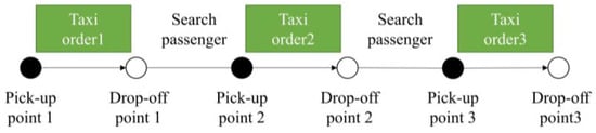Taxi order data used in this paper are provided by the Xi’an taxi management office. In the order data set, the pick-up and drop-off GPS points of multiple orders are recorded according to the time series (as described in Figure 2). In addition, the mileage and wait time of the process when drivers are searching for passengers are also detailed. The sample data format is shown in Table 2. We selected the taxi order data of 20 working days and 20 non-working days from August to November of 2019 in Xi’an for analysis. During these working days and non-working days, there are no holidays and major events which may affect residents’ travel behaviors. The influence of holidays, special events, and the contingency of single day data on the research results is excluded. In the meantime, we eliminated invalid values, error values, and the values outside the research scope. What is more, the data whose order time is less than 1 min and more than 2 h are deleted. After the above steps, a total of approximately 12 million effective taxi order records are obtained.