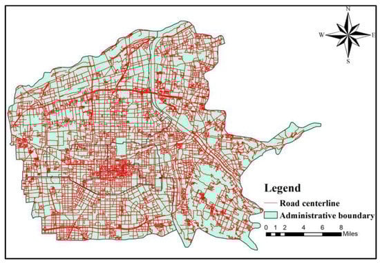 The line segment map is based on the road centerline, which has become the mainstream method for space syntax modeling and analysis. Compared with the axis model, it has a higher fitting degree for traffic flows [40]. Based on the Google online map, we vectorize the centerlines of the roads that taxis can pass through in the main urban area of Xi’an in ArcGIS 10.6 (excluding the internal roads in the closed areas such as communities, schools, units, etc.). A total of 14,041 road segments were obtained (as shown in Figure 3), and the road network line segment map of the main urban area of Xi’an was constructed after registration. The projected coordinate system of the shapefile is WGS 1984 Web Mercator Auxiliary Sphere, and the geographic coordinate system is GCS WGS 1984. Based on the line segment map, we calculate the closeness and betweenness of the road networks in the main urban area of Xi’an under different search radii with the Equations (1)–(3).