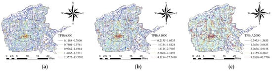 Betweenness indicates the probability of the road networks being passed by the traffic flows within the search radius. The road networks with better betweenness often have a strong passing capacity and can carry more passing traffic flows [46]. By calculating the betweenness of the road networks in the study area under different search radii, we can estimate the passing capacity and traffic diversion capacity of the road networks at different research scales. In sDNA, two phase betweenness (TPBt) is proposed to represent betweenness. Compared with the normal betweenness, TPBt focuses on the possible competition among all the destinations in a network link. Moreover, the drivers of vehicles tend to follow angular geodesics. Thus, betweenness is measured based on two phase betweenness angular (TPBtA) in this paper. TPBtA is defined as Equation (2) [55].