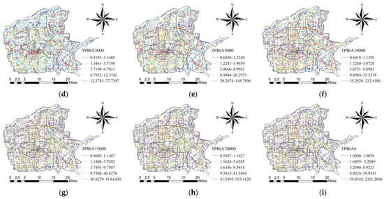 The closeness of the road networks at different scales in the main urban area of Xi’an (R denotes search radius). (a) R = 500 m; (b) R = 1000 m; (c) R = 2000 m; (d) R = 3000 m; (e) R = 5000 m; (f) R = 10,000 m; (g) R = 15,000 m; (h) R = 20,000 m; (i) R = n.