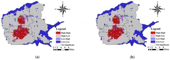 Based on the road network topological indicators (NQPDA5000, TPBtA2000) corresponding to the maximum bivariate Moran’s I, we analyze the local spatial correlation between the TOI of taxi drivers and road network topological indicators on working days and non-working days. The LISA clustering results are shown in Figure 6 and reveal similar local spatial clustering and outlier characteristics under the same research scale on working days and non-working days. High-High (HH) indicates the spatial phenomenon in which research grids with high value of TOI are surrounded by research grids with high value of road network topological indicators; High-Low (HL) indicates the spatial phenomenon in which research grids with high value of TOI are surrounded by research grids with low value of road network topological indicators; Low-High (LH) indicates the spatial phenomenon in which research grids with low value of TOI are surrounded by research grids with high value of road network topological indicators; and Low-Low (LL) indicates the spatial phenomenon in which research grids with low value of TOI are surrounded by research grids with low value of road network topological indicators.