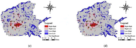 Bivariate local Moran’s I analysis map. (a) The TOI of taxi drivers is the first variable and NQPDA5000 is the second variable on working days. (b) The TOI of taxi drivers is the first variable and NQPDA5000 is the second variable on non-working days. (c) The TOI of taxi drivers is the first variable and TPBtA2000 is the second variable on working days. (d) The TOI of taxi drivers is the first variable and TPBtA2000 is the second variable on non-working days.