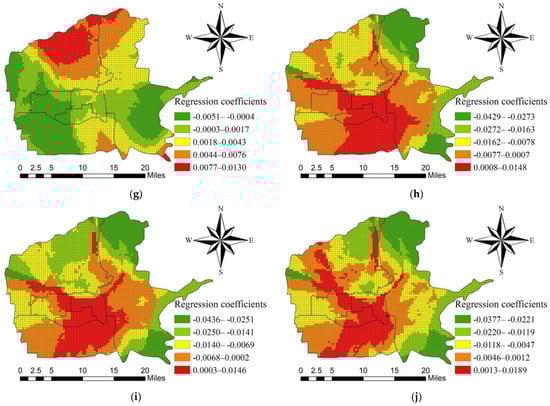 Spatial patterns of road network topological variables regression coefficients. (a) NQPDA5000, working days; (b) NQPDA10000, working days; (c) NQPDA15000, working days; (d) NQPDA20000, working days; (e) TPBtA10000, working days; (f) TPBtA15000, working days; (g) TPBtA20000, working days; (h) NQPDA10000, non-working days; (i) NQPDA15000, non-working days; (j) NQPDA20000, non-working days.