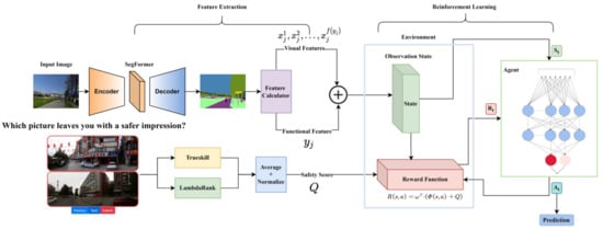 Unlike previous studies, this study proposes a complete evaluation framework to predict human perceptions of safety from geotagged images of urban spaces. This is the first study to make high-level judgements on urban safety by combining visual–semantic features and reinforcement learning (RL) methods. Referring to [,,], we modelled the problem of urban-safety perception as a Markov decision process (MDP) problem [] and then used the deep reinforcement-learning (DRL) algorithm to solve it to obtain a human-like perception policy on urban safety. It was experimentally established that the RL-based framework outperformed previous regression and convolutional neural network (CNN)-based methods. By simulating the sensory basis of humans in decision making, we could visualise safety perception evaluation patterns and form a reward function for the RL process to guide the output of the model. Using this new framework, the construction process of subjective perception could be analysed at a deeper level. In addition, our framework permitted the quantitative analysis of the image’s visual–semantic features, which correlated with the concept of perceived safety.