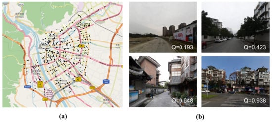 Building the Dataset. The original dataset used in this study was based on street-view images of Dujiangyan City provided by the Baidu street-view API. The dataset included 11,584 panoramas, each panorama being sliced into four images corresponding to the four angles of observation (−90°, 90°, 180°, 270°). We also obtained the latitude–longitude values of the images through the GPS satellite positioning of the street car that took the pictures. Owing to the data-collection method of the Baidu street-view platform, the original dataset had a high level of redundancy, which was not convenient for annotation and analysis. Therefore, we filtered and constructed a smaller dataset for this study. Based on the latitude–longitude values, we obtained the specific street locations corresponding to each image and built the dataset by randomly filtering the images according to the street locations (Figure 2a). In this process, we ensured that the images were geographically averaged, which meant that our dataset reflected the overall appearance of Dujiangyan City. In contrast to [], we concatenated the images of the four orientations in a two-by-two sequence, thus simulating the horizontal view of the human eye []. We used panoramas for the crowdsourcing data annotation to obtain better subjective safety indicators.