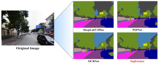 To calculate the FoV, we used the semantic segmentation technique to segment the city scenes into scene elements and calculate their coverage ratio, that is, the pixel proportion (Figure 3). The scene elements included the sky, vegetation, terrain, poles, buildings, walls, fences, roads, sidewalks, traffic signs, and traffic lights. SegFormer [], OCRNet [], and DeeplabV3 + [] were used to obtain the best results. All techniques were trained using the Cityscapes dataset []. We eventually applied the SegFormer model, which combines a transformer with a lightweight multilayer perceptron (MLP) decoder. No positional coding was required, thus avoiding interpolation, which can lead to performance degradation when the test resolution differs from the training. It was also proposed that the MLP decoder aggregate information from different layers, combining local and global attention for semantic representation.
