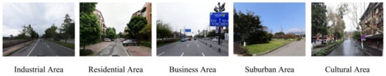 Functional features. The city can be seen as a combination of many different functional areas [], while a specific geographic location can impact safety perception. For different functional areas (Figure 4), we defined functional features as visual features that could fully express the characteristics of their locations. It should be noted that, in the feature vector representation, the functional features were reflected in ordinal numbers, with different numbers representing different functional areas.