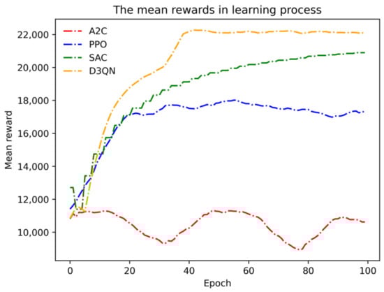 Implementation Details. We used the DRL algorithms PPO, A2C, SAC, and D3QN for training on the open-source RL library Ray RLlib. The training epochs were set to 100; in this case, the trained model could maintain a good balance between the convergence speed and the strategy efficiency.
