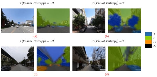 Figure 7 shows the reward maps for the four different situations. In Figure 7a, the image is considered safe, with each visual feature receiving different rewards according to the functional feature. The vehicle number receives a reward of 3, whereas the Sky-FoV, Building-FoV, and Greenary-FoV all receive a reward of −1. Furthermore, the number of vehicles in the street-view image is consistent with the experts’ perception of a safe image. At the same time, the sky openness, building area, and greenery area are consistent with the experts’ judgements on the negative points affecting safety.