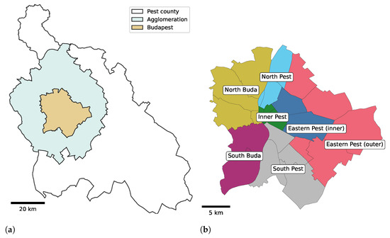 Hungary is a typical capital-oriented country. Budapest is the political, economic, logistical, and cultural center of the country, where almost 18% of the population live [1]. In 2017, the population of Budapest was 1,749,734, and the population of Pest county was 1,247,372. In the agglomeration of Budapest, 837,532 people lived according to the Hungarian Central Statistical Office (HCSO) [2]. The Danube river divides the city into the Buda and the Pest side.