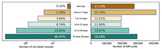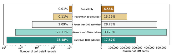 The data set contained 955,035,169 CDRs collected by the operator for billing purposes, from 1,629,275 SIM cards. Figure 2 shows the mobile network activity distribution between the activity categories of the SIM cards. The left part of the figure displays the number of CDRs that a group of SIM cards generated. The right part of the figure shows the number of SIM cards in that group. Only 17.67% of the SIM cards generating more than 1000 CDRs provided the majority (75.48%) of the mobile phone activity during the observation period. Figure 3 has the same structure and shows the distribution of the SIM cards by the number of active days. Only about one-third (33.23%) of the SIM cards have activity on at least 21 different days. Despite the relatively large number of SIM cards present in the data, most of them were not active enough to provide enough information about their users’ mobility habits.