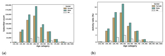 The provided mobile network data included information about the age and the gender of the cell phone subscribers in about 66.17% and 70.76% of the subscribers, respectively. Figure 4a shows the number of subscribers by age category and gender. Figure 4b shows the ratio of the generated CDRs of subscribers by age category and gender. Note that the subscribers without age information are omitted from the figures. Most of the Vodafone subscriptions—with information about the subscriber age—were owned by males in their forties. It is also notable in Figure 4b that most of the mobile network activity is generated by devices owned by subscribers in their thirties or forties.