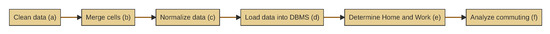 Identifying the home and work locations of a cell phone subscriber is a common and crucial part of the CDR processing, as a good portion of the people live their lives in an area that is determined by only their home and workplace [13,14]. Since these locations fundamentally determine people’s mobility customs, the commuting trends can be analyzed between these locations. Commuting is studied using mobile network data within a city [14,15] or between cities [16,17,18,19] and also examined by social network data, such as Twitter [20,21,22].
