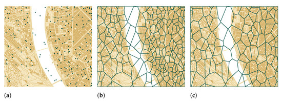 The close cells within 100 m were merged (Figure 5b) using the DBSCAN algorithm of the Scikit-learn [41] Python package. The number of records associated with a cell during the observation period was applied as weight. The less-active cells were merged into the more active ones similarly, as in [15]. After the merge, the Voronoi tessellation was applied to the merged cell centroids. Figure 6 shows the difference between the Voronoi polygons before (Figure 6b) and after (Figure 6c) the cell merge. The merged cell polygons became larger on average and roughly covered a house block downtown.