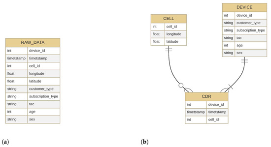 The obtained, “raw” data had a wide format (Figure 7a), which was normalized (Figure 5c) before importing into the database. The CDR table only contained the SIM ID, the timestamp, and the cell ID. A table was introduced to store the SIM-related properties (such as subscription type, customer type, age, gender) and another to store the cell properties (geographic coordinates). Figure 7b displays the normalized schema.