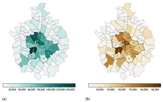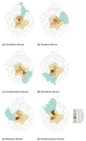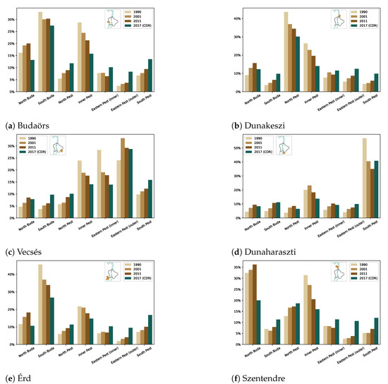 Figure 13 shows the commuters’ distribution in the districts of Budapest, from the six sectors of the agglomeration, based on the CDR evaluation. In representation, Figure 13a–f are analogous to Figures 2–9 in [7], and show to which districts the inhabitants commute from the given sector of the agglomeration.