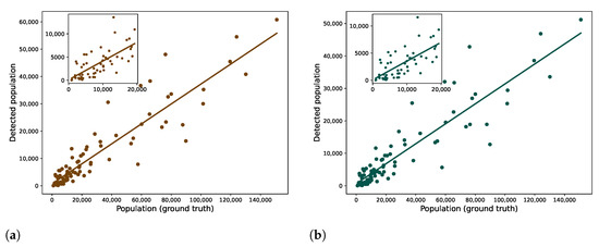 Apart from this, the findings based on CDRs correlated with the statistical data; the Pearson’s R was 0.9213 ( was 0.8488), counting every SIM cards. Other studies found similarly strong correlation values between population statistics and the detected homes [36,49]. Figure 9a shows this as a regression plot. As described in the authors’ previous work [40], the obtained call detail records contained information (TAC) about the devices that used the mobile network. Based on this information, more than 300,000 SIM cards were identified that operated other types of devices than cellphones (e.g., 3G modem), indicating that they did not represent people. Figure 9b illustrates the correlation without these SIM cards. Although the population values were decreased, the correlation did not seem significantly affected: Pearson’s R was 0.9125.