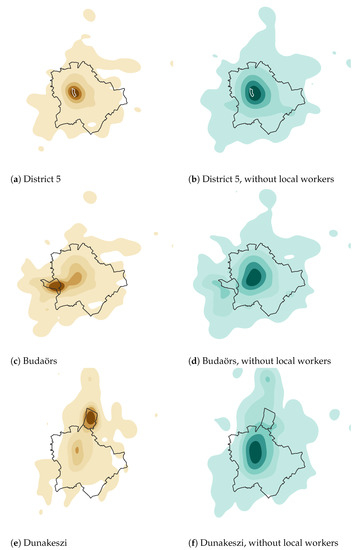 Using kernel density plots (with Gaussian kernel) to display the typical working locations for three selected settlements and a district of Budapest, with (a,c,e) and without (b,d,f) local workers. The administrative boundaries of Budapest and the selected settlements are also displayed.