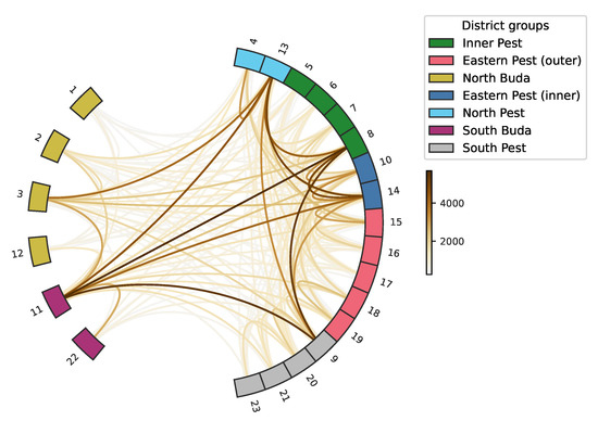 The commuting between the districts of Budapest was also treated as a network, where the districts were nodes, and an edge represented a commuter that connected two districts. The network-based commuting or traffic flow analysis also has a long history (e.g., [43,44]). The NetworkX Python package [45] was used to build a graph, which was visualized by the chord diagram of the “mne_connectivity” package.
