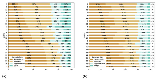 Figure 12 shows the comparison between the CDR and the census-based (Figure 1 in [9]) traveling ratios of the commuters by the districts of Budapest and the home location category. People who work in Budapest are represented, and the home location can be (i) the same district where one works, (ii) another district of Budapest, (iii) the agglomeration, and (iv) other settlements outside the agglomeration.