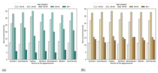 Comparing data obtained by the microcensus and the cellular information, good agreements (Pearson’s R is 0.8977) were found on the trends and measures of the distribution of the commuters by age categories. The most significant difference between the census and the CDR-based data were within the “60+” and the “50–59” categories. The number of people in their fifties seemed underrepresented by the CDR data, while the “60+” category was overrepresented, which might have been caused by the different interpretation of the upper limit. On the other hand, the values were very similar in the other categories. Based on the similarity of the results (Figure 15), it was confirmed that mobile network data can be a reliable method for commuting analysis even regarding demographic features.