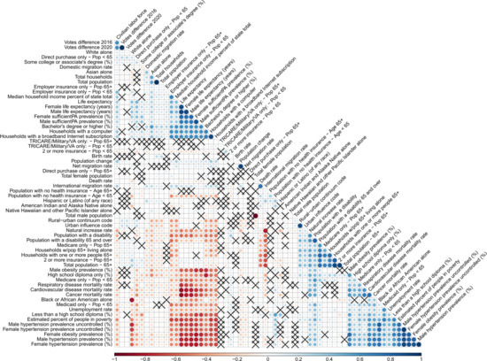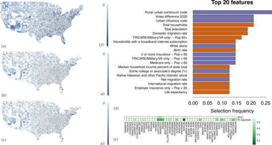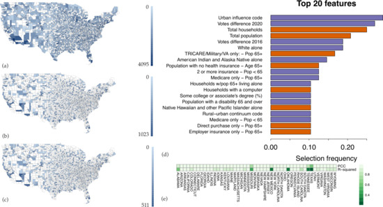 We then applied an identical approach to generate a spatial model utilizing COVID-19-associated deaths over the first 30 days following the first death in each county as the dependent variable (Figure A4). Consistent with prior reports, the features most frequently selected to predict deaths included measures of advanced age and non-white race [23,24]. Vote difference 2020 remained the second most frequently selected feature to predict deaths.