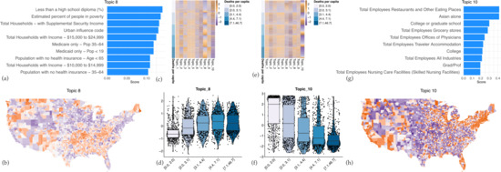 Topic modeling identifies associations between sets of spatial features and COVID-19 dynamics. (a) Top 10 feature scores for features associated with topic 8. (b) Topic 8 scores for each county in the US. Legend of the map is the same as the topic score heatmaps given in (c,e). (c) Heatmap of each county z-scored topic score against the mean deaths during the nationwide phase, binned into quintiles. To highlight the relationships between topic scores and deaths, the heatmap is sorted by topic 8. (d) Boxplot of topic scores for each county across death quintiles for topic 8, showing positive correlation with death counts. (e) Heatmap of each county z-scored topic score against the mean deaths during the nationwide phase, binned into quintiles. In order to highlight the relationships between topic scores and deaths, the heatmap is sorted by topic 10. (f) Boxplot of topic scores for each county across death quintiles for topic 10, showing negative correlation with death counts. (g) Top 10 feature scores for features associated with topic 10. (h) Topic 10 scores for each county in the US. Legend of the map is the same as the topic score heatmaps given in (c,e).