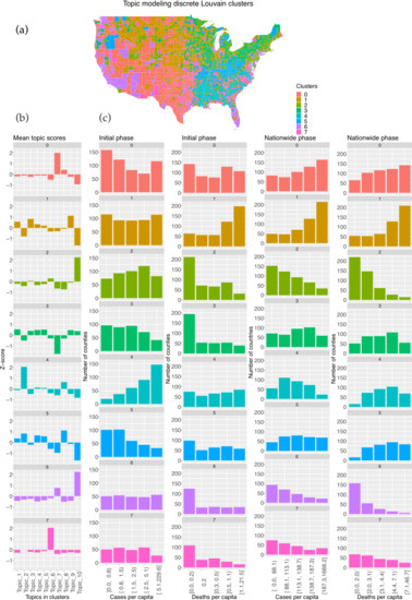 Counties clustered using spatial topics show similar patterns in COVID-19 cases/death counts. Clustering by topics can identify high- and low-risk counties. (a) Geographical map of counties and their discrete cluster assignments when topic-county matrix inputted into Louvain clustering. (b) Mean topic score for each topic for each of the 9 clusters of counties. (c) Bar graph of the number of countries within each cluster that fall within each quintile bin of cases and deaths for the initial as well as nationwide phases of the pandemic.