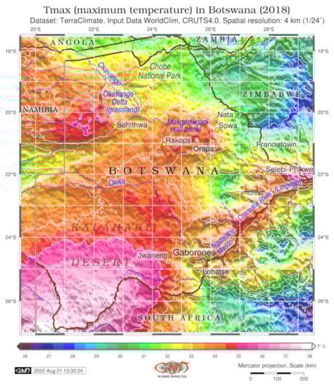 The general objective was to map the variability of environmental and climate parameters of the country using the TerraClimate dataset. The variables in this dataset are designed such that one can evaluate the GMT approach with respect to various data dimensions and various parameters over the study area. Specifically for the territory of Botswana, while mapping the TerraClimate dataset, we address handling and visualising the diverse extent of values in climate parameters, from small to large ones. This is important, since difficulties in spatial data processing arise when data have contrasting dimensions, e.g., temperature, topography, and PDSI values differ and various colour scales for proper mapping and effective cartographic visualisation are required, which was managed using the GMT solutions.